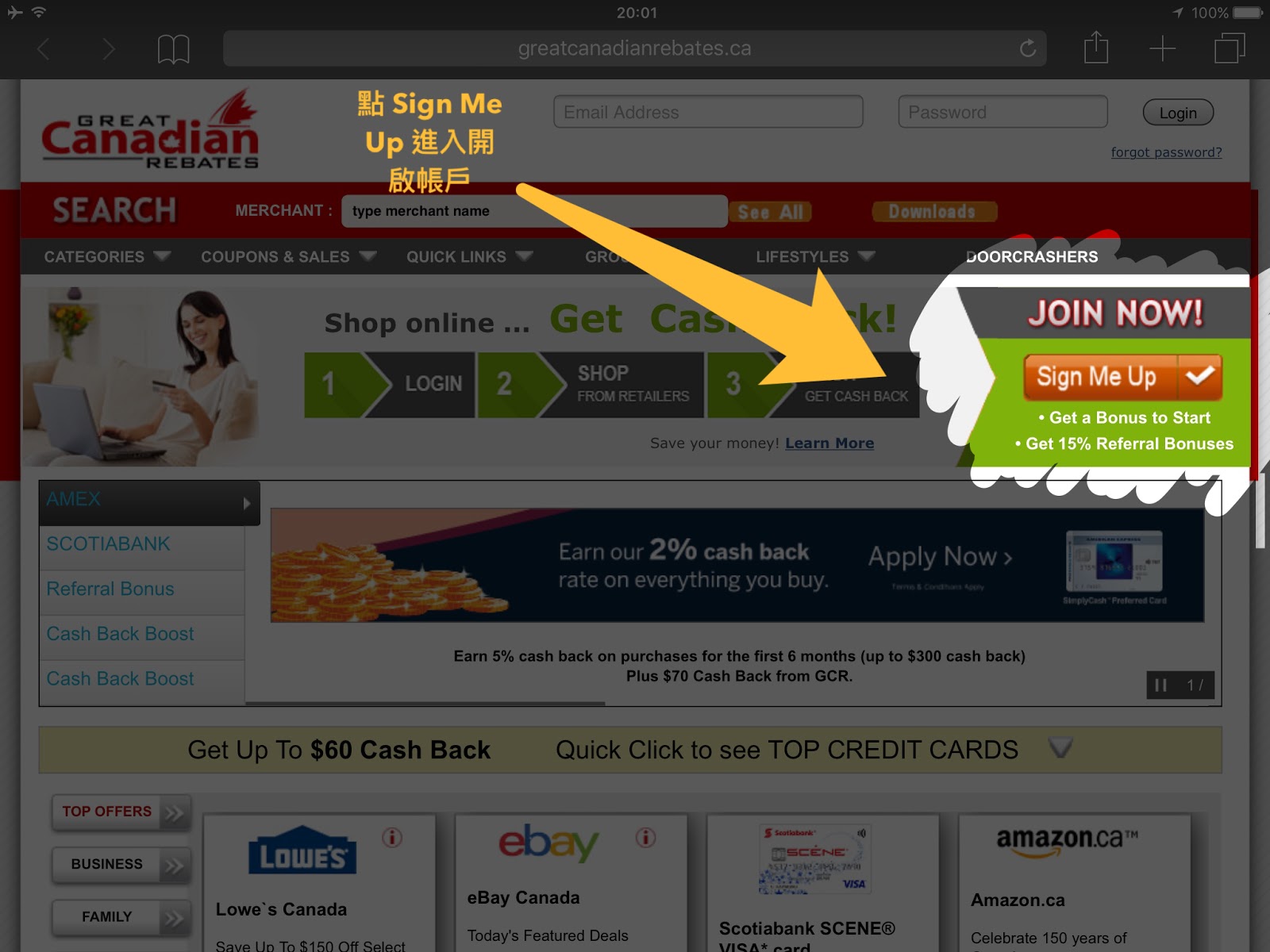 1 - 連至 Great Canadian Rebates 首頁,點 Sign Me Up 以開啟帳戶。