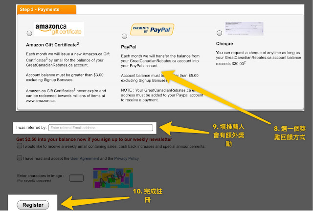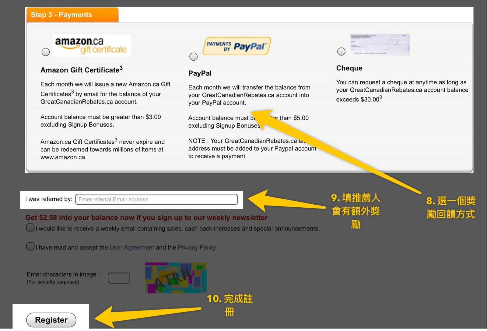 4 - Step 3 選擇 GCR 獎勵兌換方式,有三種,這邊推薦右邊的 Cheque,當獲得獎勵超過 $30 時,GCR 會寄送支票給你兌換現金(申請 Chq + Sav 會獲得 $48 獎勵,可立即兌換),完成後點 Register 完成註冊。